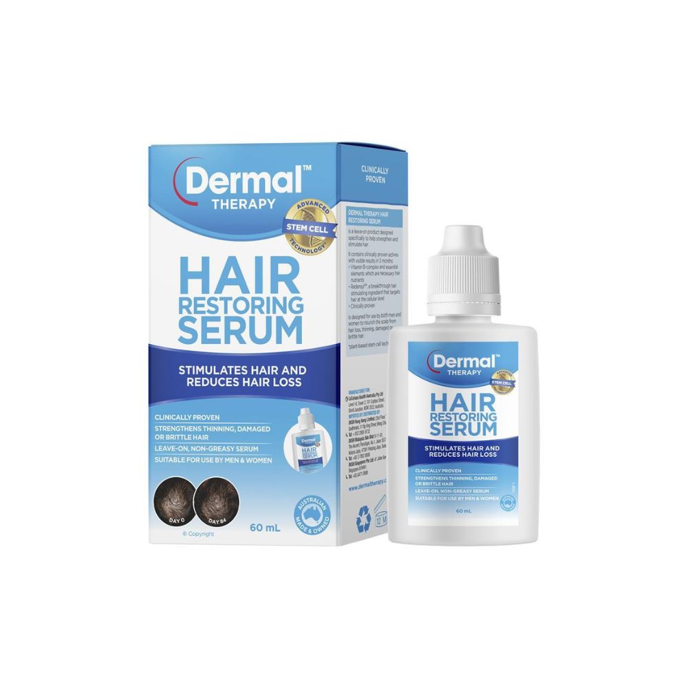 Dermal Therapy Hair Restoring Serum is a leave-on, non-greasy formula designed to strengthen and stimulate hair. Suitable for both men and women, it nourishes the scalp and helps reduce hair loss, thinning, and breakage. With clinically proven actives like Redensyl and vitamin B-complex, it delivers visible results in as little as 3 months.