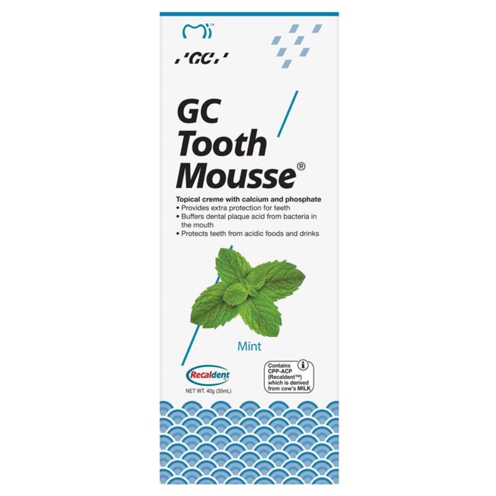 GC Tooth Mousse™ Mint is a fluoride-free crème that helps protect teeth by neutralising acids and supporting enamel remineralisation. Formulated with calcium and phosphate in RECALDENT™ (CPP-ACP), it strengthens and brightens enamel while helping prevent decay, erosion, and sensitivity. Suitable for all ages, including children, with a refreshing mint flavour.