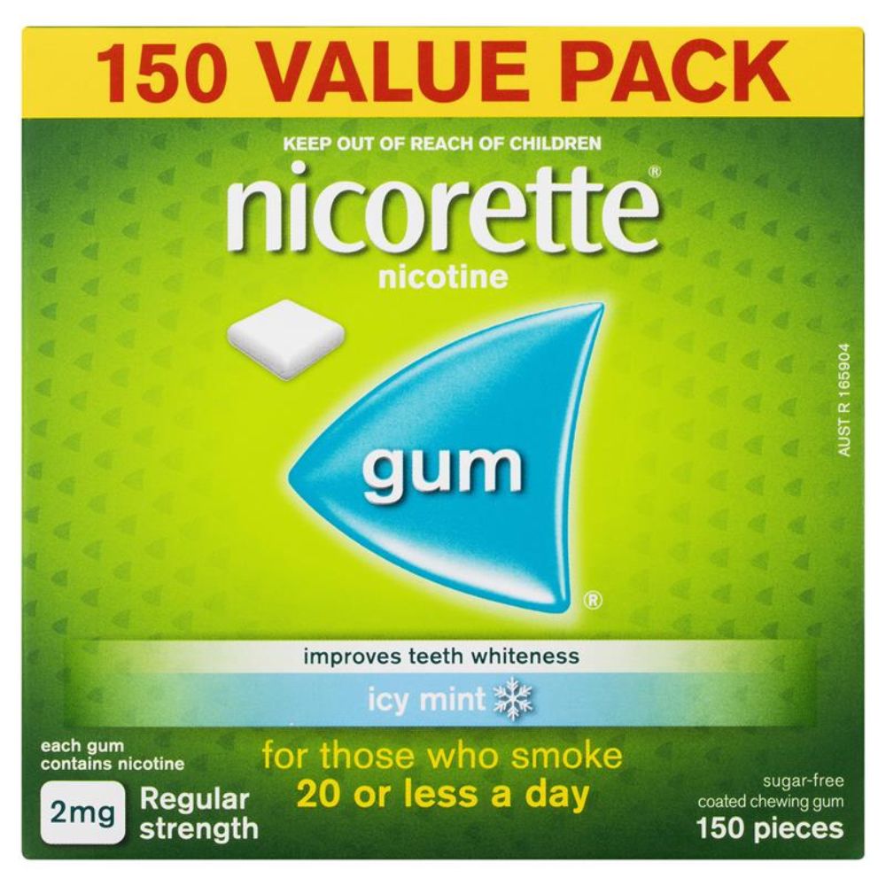 Nicorette Nicotine Gum Coated Icy Mint 2mg is a sugar-free quit-smoking aid with 2-in-1 action, helping to fight nicotine cravings while improving teeth whiteness. This regular strength 2mg coated gum is suitable for people who smoke 20 or fewer cigarettes a day and provides discreet craving relief with a refreshing icy mint flavour. It can be used to stop smoking abruptly or cut down before quitting, and may also be used alongside other Nicotine Replacement Therapy (NRT) products for added support. Pack size: 150 coated chewing gums.