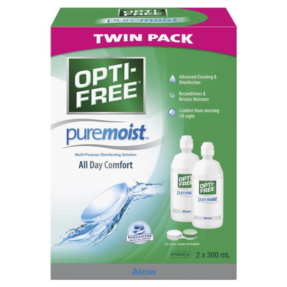 Opti-Free® PureMoist® Twin Pack is a multi-purpose contact lens solution that cleans, rinses, disinfects, and stores lenses while removing lipid and protein deposits daily. Featuring HydraGlyde® Moisture Matrix, it provides up to 16 hours of lasting moisture for comfortable lens wear from insertion to removal. Gentle yet effective, it offers dual disinfection and is suitable for all silicone hydrogel and soft contact lenses.